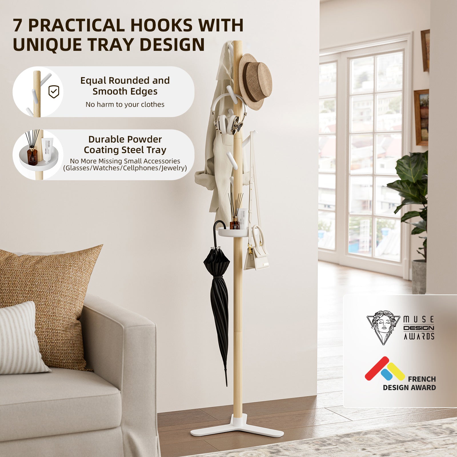 Unsere freistehende Garderobe KAPANOU wurde mit dem Silver Muse Design Award und dem French Design Award 2023 ausgezeichnet. Sie besticht durch ihr minimalistisches, baumartiges Design und ist aus hochwertigem Gummibaumholz gefertigt, was sie ästhetisch ansprechend und langlebig macht. Dank des stabilen Standfußes kippt sie beim Aufhängen mehrerer Gegenstände nicht um. Wir haben die Garderobe mit einer runden Ablagefläche ausgestattet. So können Sie zu Hause Ihre Uhr, Brille, Halskette oder Schlüssel bequem an einem Ort aufbewahren und den Ärger über verlorene Kleinigkeiten vermeiden. Unser Kleider-Organizer ist in zwei Höhen verstellbar und somit für Kinder und Erwachsene geeignet. Die sieben farblich abgesetzten Haken bieten ausreichend Platz zum Aufhängen schwerer Jacken, Pullover, Taschen, Schals, Mützen und anderer Gegenstände und machen ihn modern und funktional zugleich. Perfekt für Eingangsbereiche, Wohnzimmer, Schlafzimmer, Badezimmer, Büros und mehr – ein vielseitiges und langlebiges Möbelstück.
