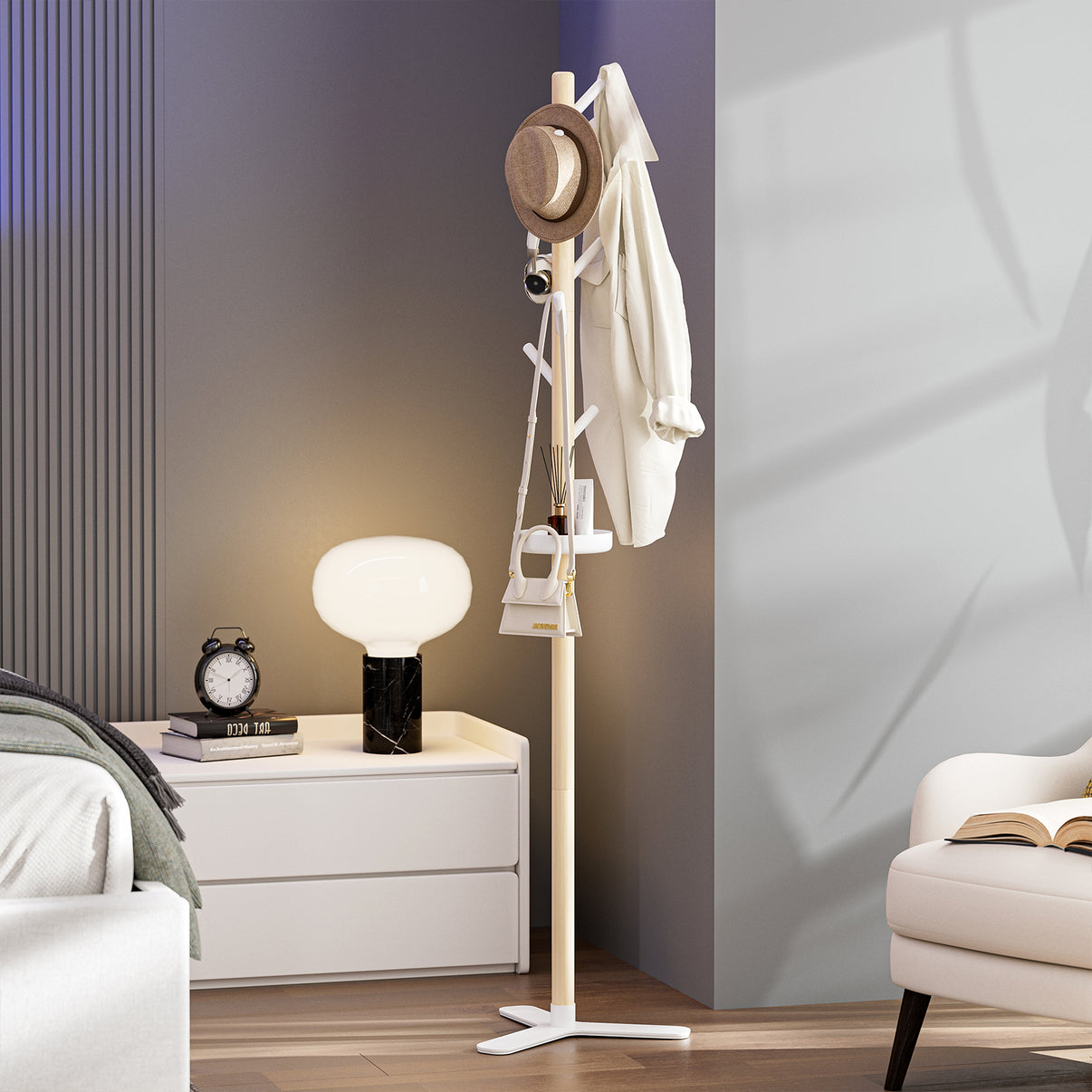 KAPANOU Holzgarderobe, freistehend, Flurgarderobe, rustikaler Kleiderständer mit Ablage, 7 Haken für Hut, Handtasche, Jacke, Regenschirm und Accessoires, Holz, Braun/Weiß
