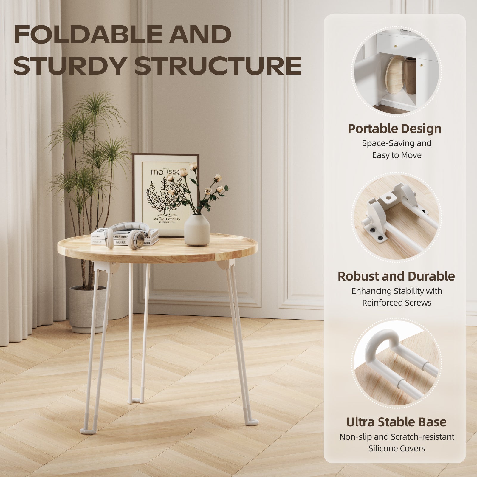 PREMIUM DESIGN: This folding table has an elegant appearance. Based on the design of foldable legs and non-slip rubber feet, it has good stability, it is convenient for storage and movement