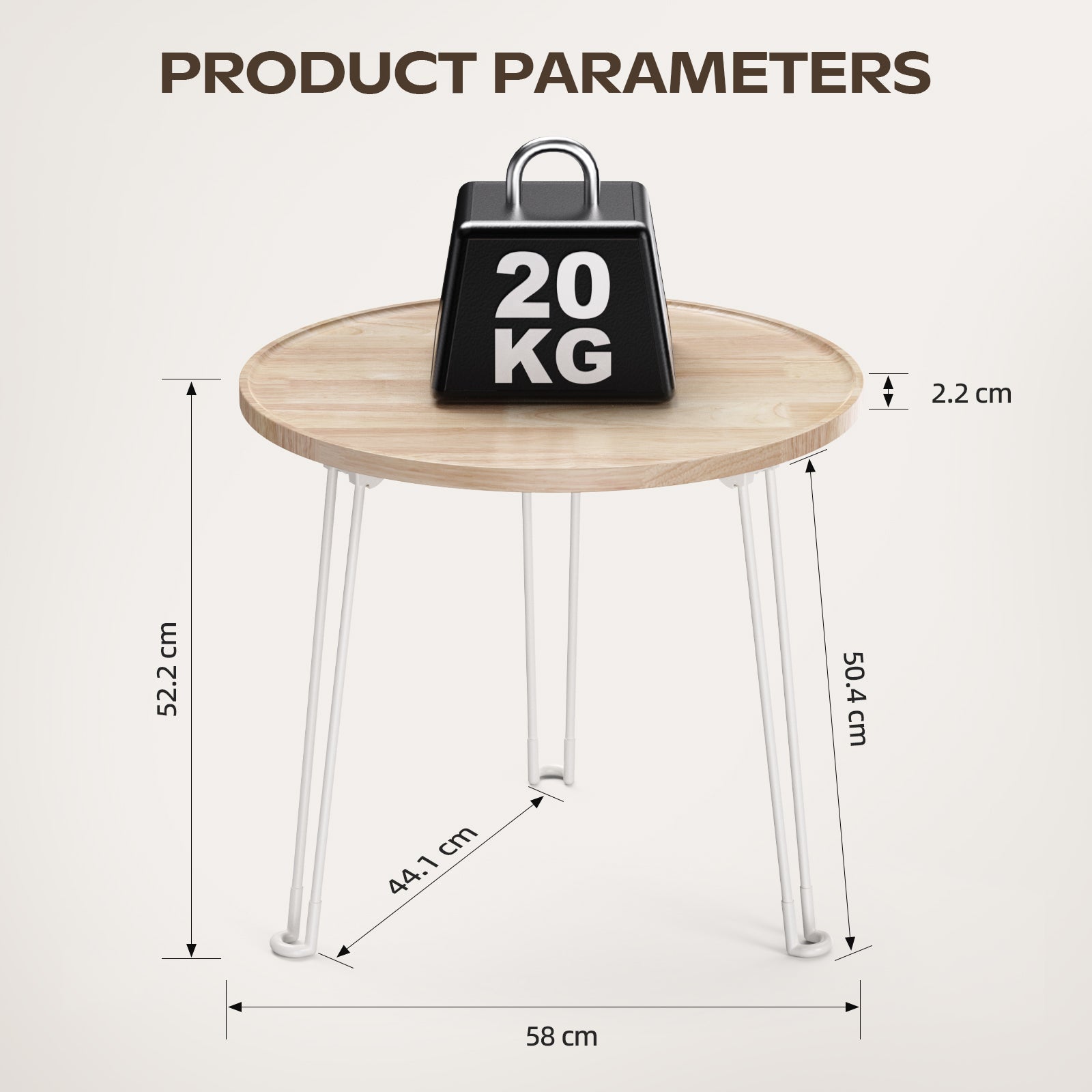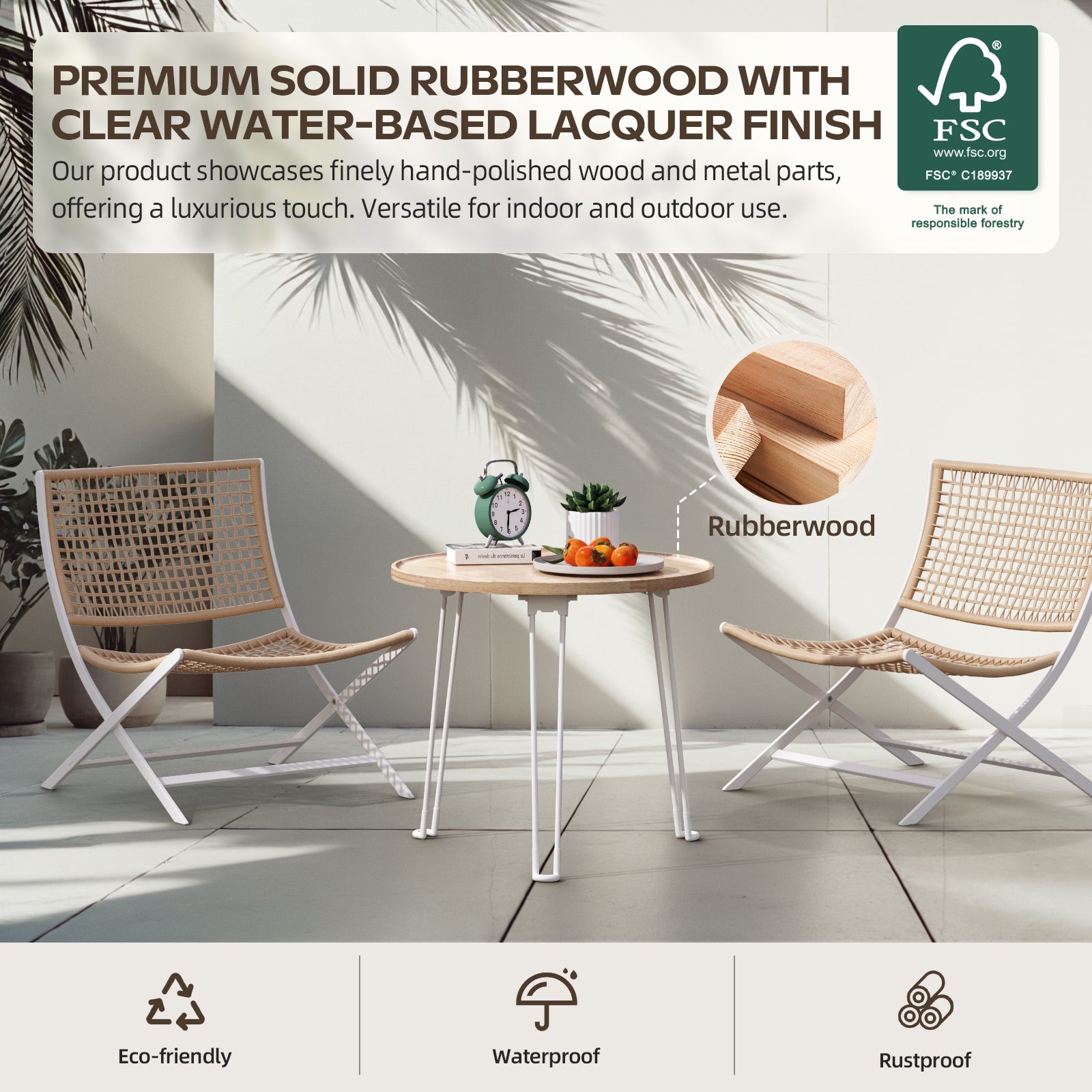 SUITABLE USE SIZE: Table unfolded dimensions: 22.8"(L) x 22.8"(W) x 20.5"(H); Folded dimensions: 22.8" (L) x 22.8" (W) x 3.46"(H). Total weight: 13.2lbs. Material: FSC-certified rubber wood, powder-coated carbon steel, ensuring long-lasting durability and resistance to deformation, scratches, and rust.