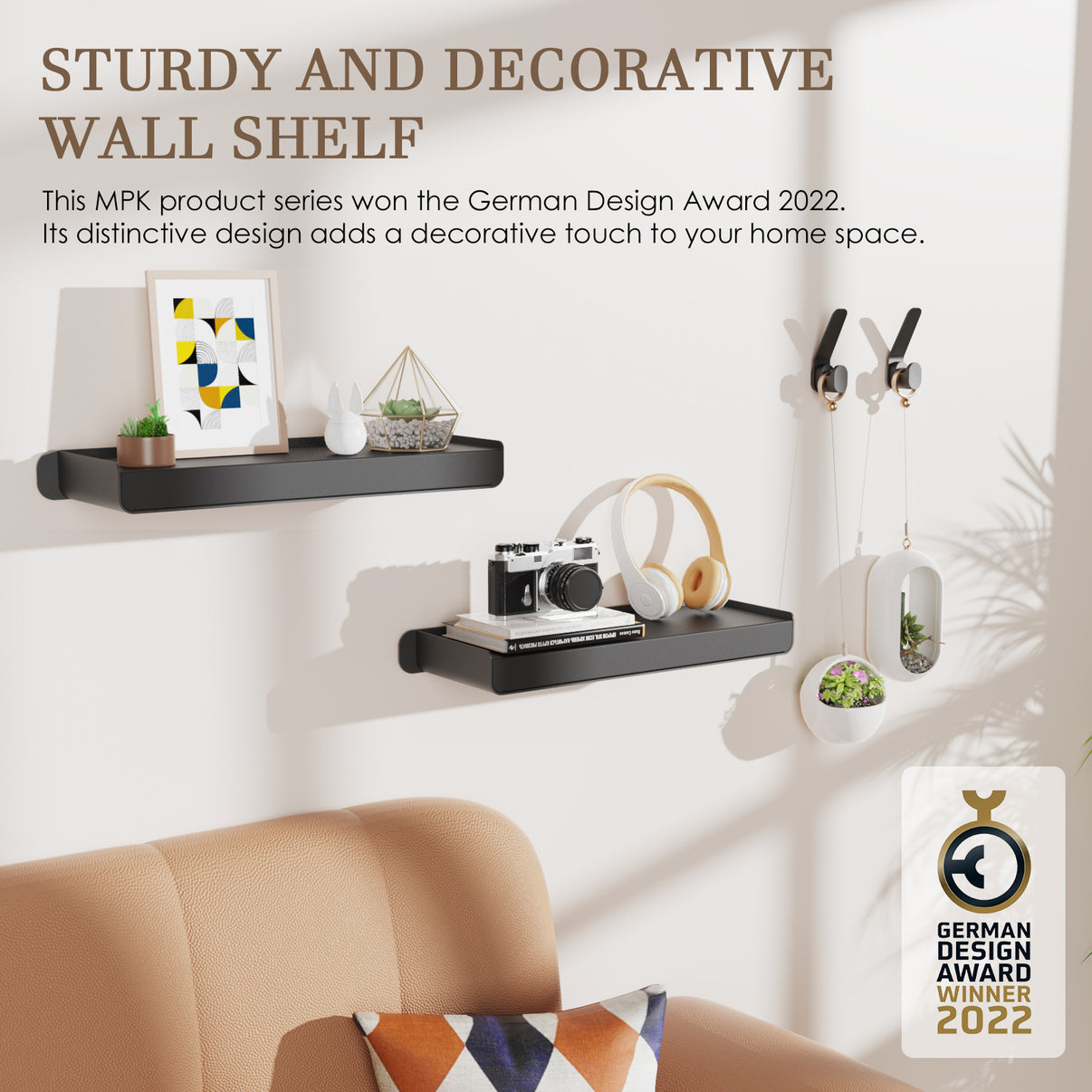 This KAPANOU floating shelf have been awarded the 2022 German Design Award. Constructed from durable and high-quality aluminum metal, they are waterproof, sturdy, and rust-resistant. These minimalist shelves not only add a decorative touch to your home but also offer ample space to display or store a variety of items. Ideal for showcasing books, frames, plants, children's toys, organizing bathroom essentials, or kitchen spices, these shelves help keep your home tidy and organized. Their simple yet modern design allows for a visually pleasing and orderly arrangement of items in your home, creating a sense of relaxation and joy.