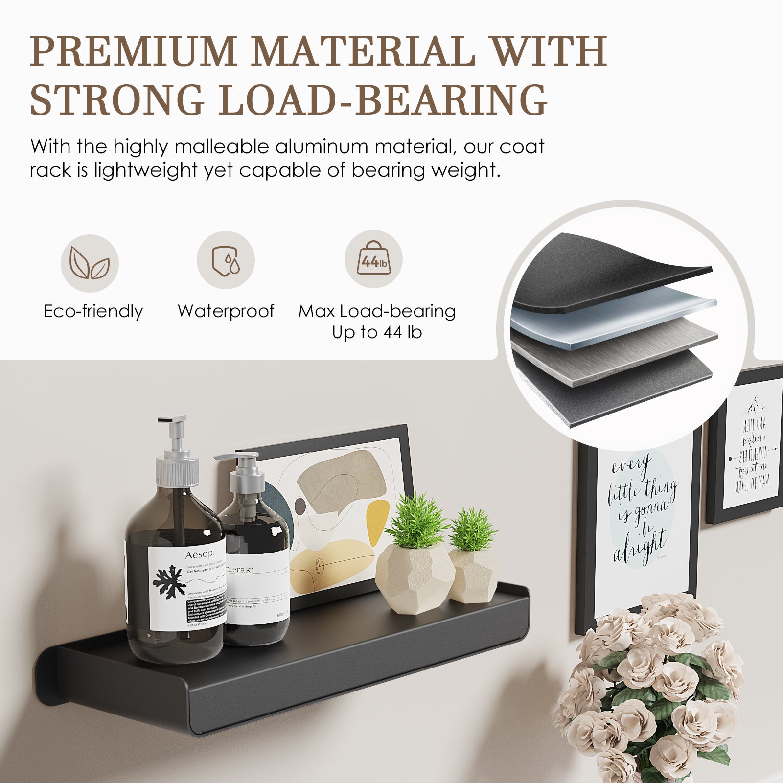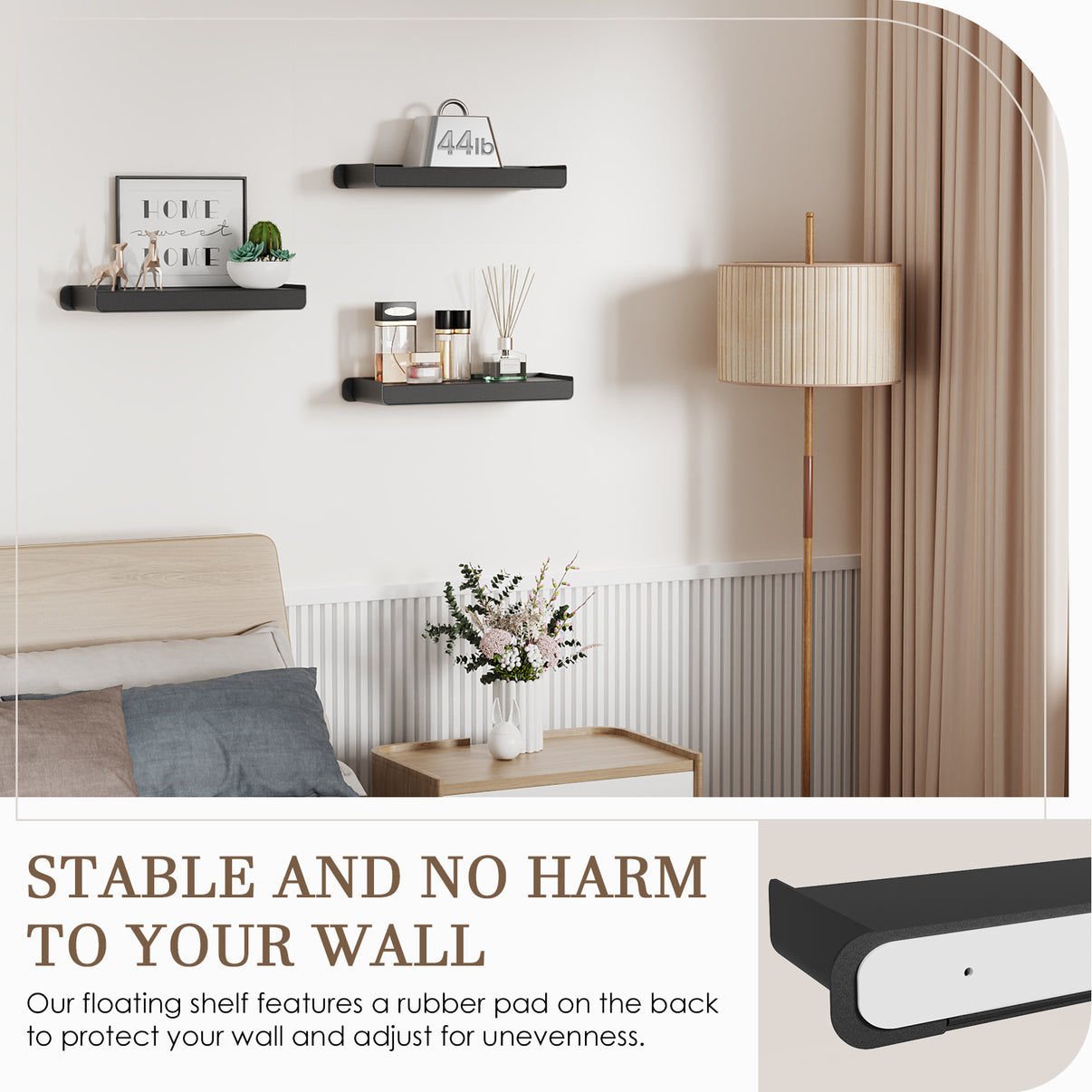 【Sturdy And Durable Shelf】KAPANOU floating shelves are crafted from heavy-duty and premium aluminum metal, ensuring they are waterproof, stable, and rust-resistant. With excellent weight capacity, it can easily hold up to 44 pounds and has a gray rubber pad on the back to protect walls from damage. If the wall is uneven, the pad can also play an adjusting role.