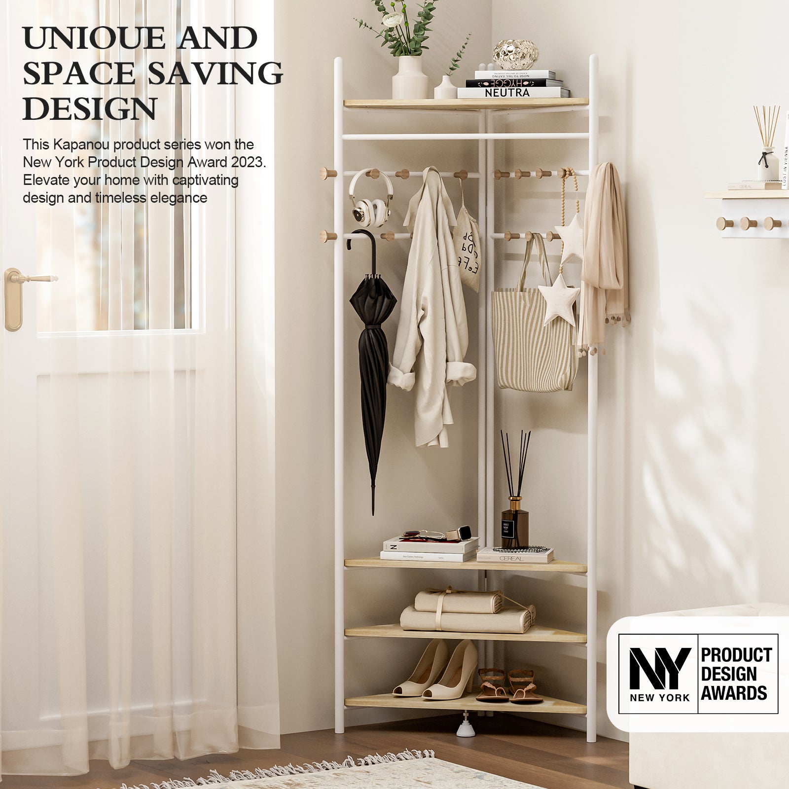 We proudly announce that our Kapanou corner coat rack has won the 2023 New York Product Design Award. It features a unique hinge connection installation method and additional reinforced feet, ensuring easy installation and stability without wobbling. The wooden shelves and hooks of our coat rack are made of high-quality and sturdy rubberwood, certified by the Forest Stewardship Council (FSC), and coated with clear lacquer for aesthetics and waterproof durability. The metal materials are also excellently powder-coated, providing a flawless, smooth surface that won't chip. With 18 practical hooks and five shelves, it offers ample space for hanging heavy jackets, sweaters, bags, scarves, hats, and more. Its distinctive combination of metal and wood design makes it modern and functional. It is perfect for entryways, living rooms, bedrooms, bathrooms, offices, and various other settings, serving as a durable and versatile piece of furniture.