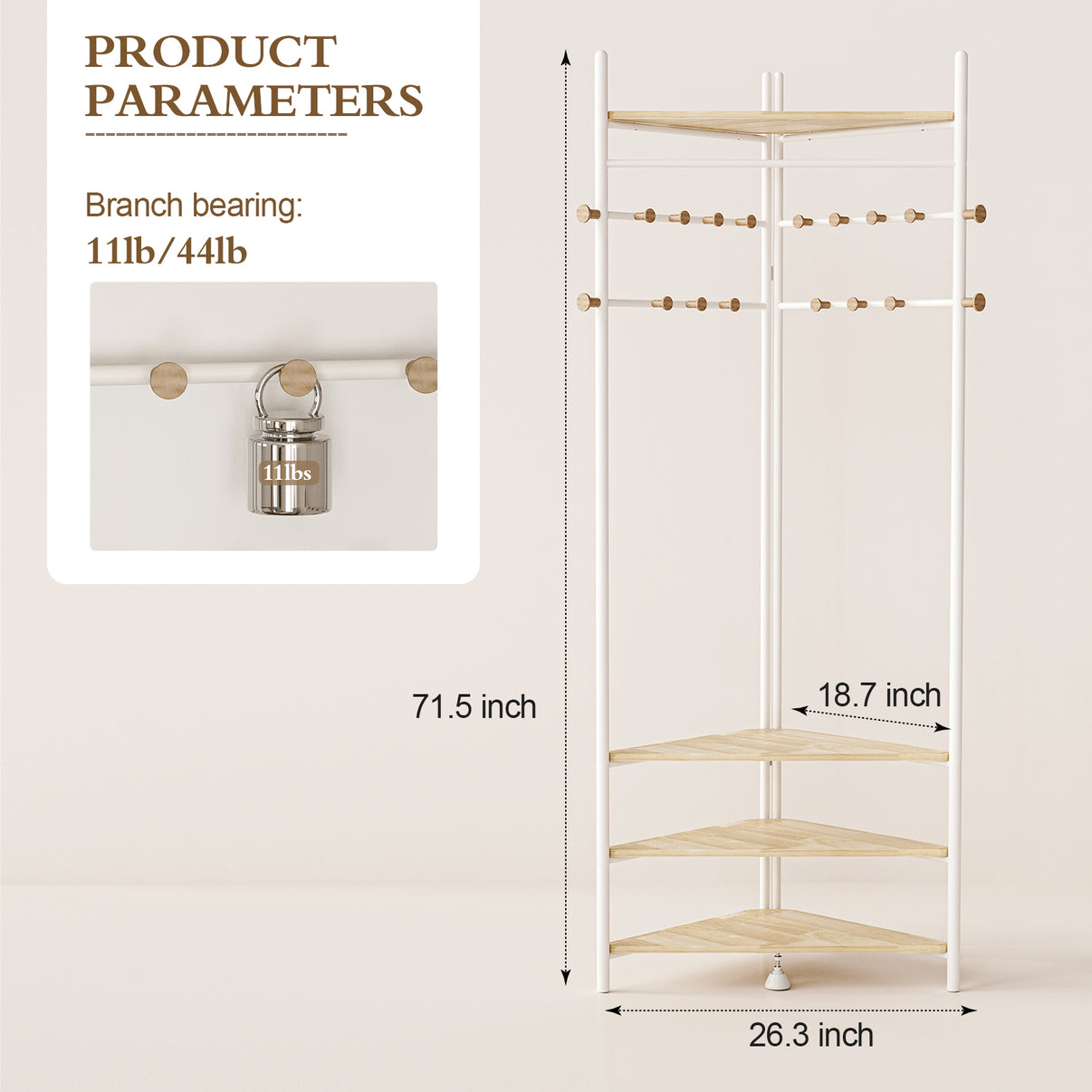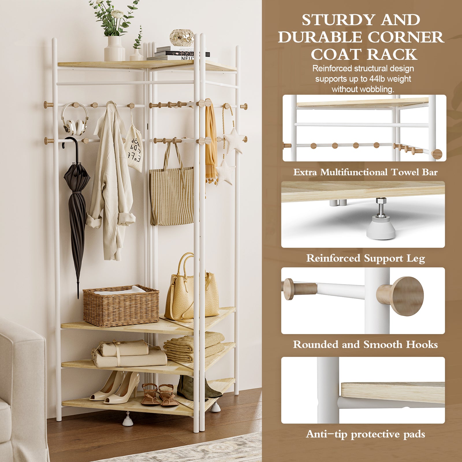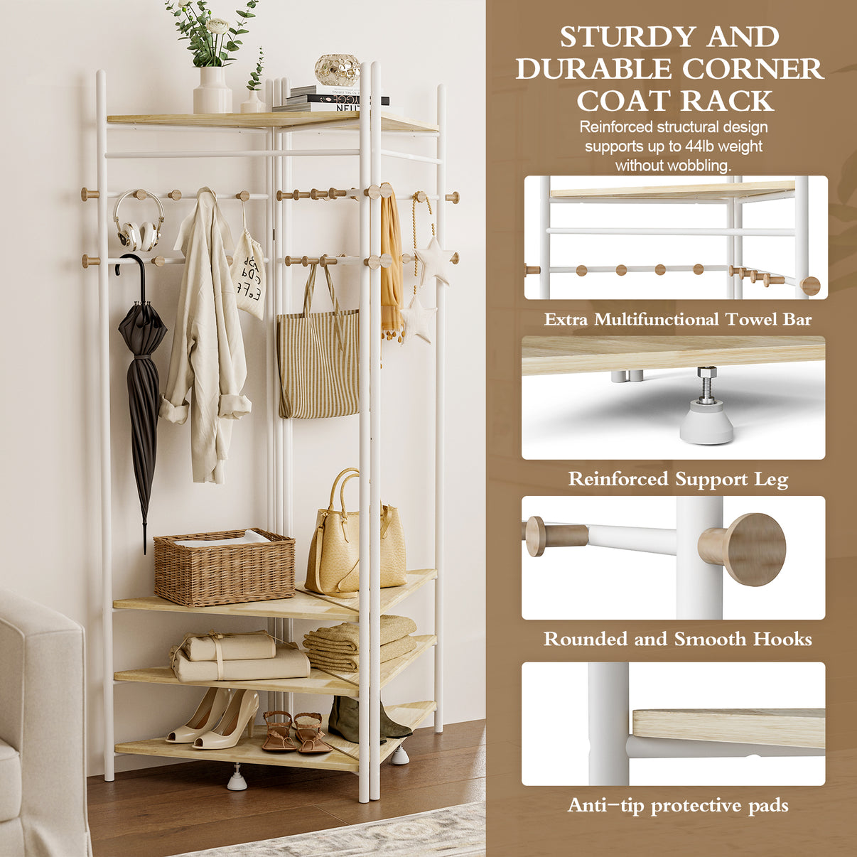 KAPANOU Corner Metal Coat Rack Freestanding Entryway Clothes Hanger with 18 Wooden Hooks and 4 Shelves for Bedroom (White)