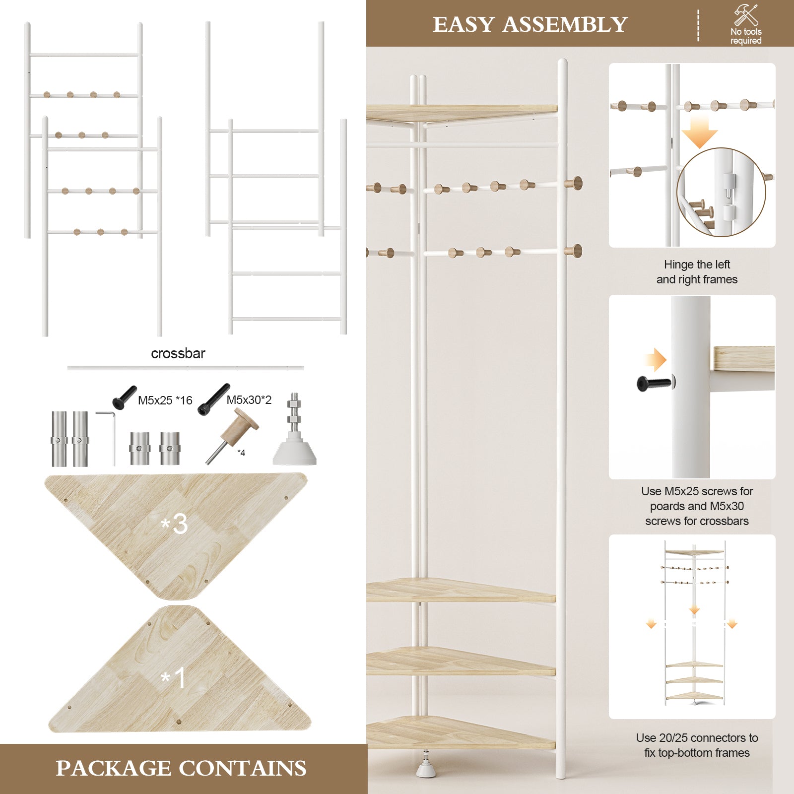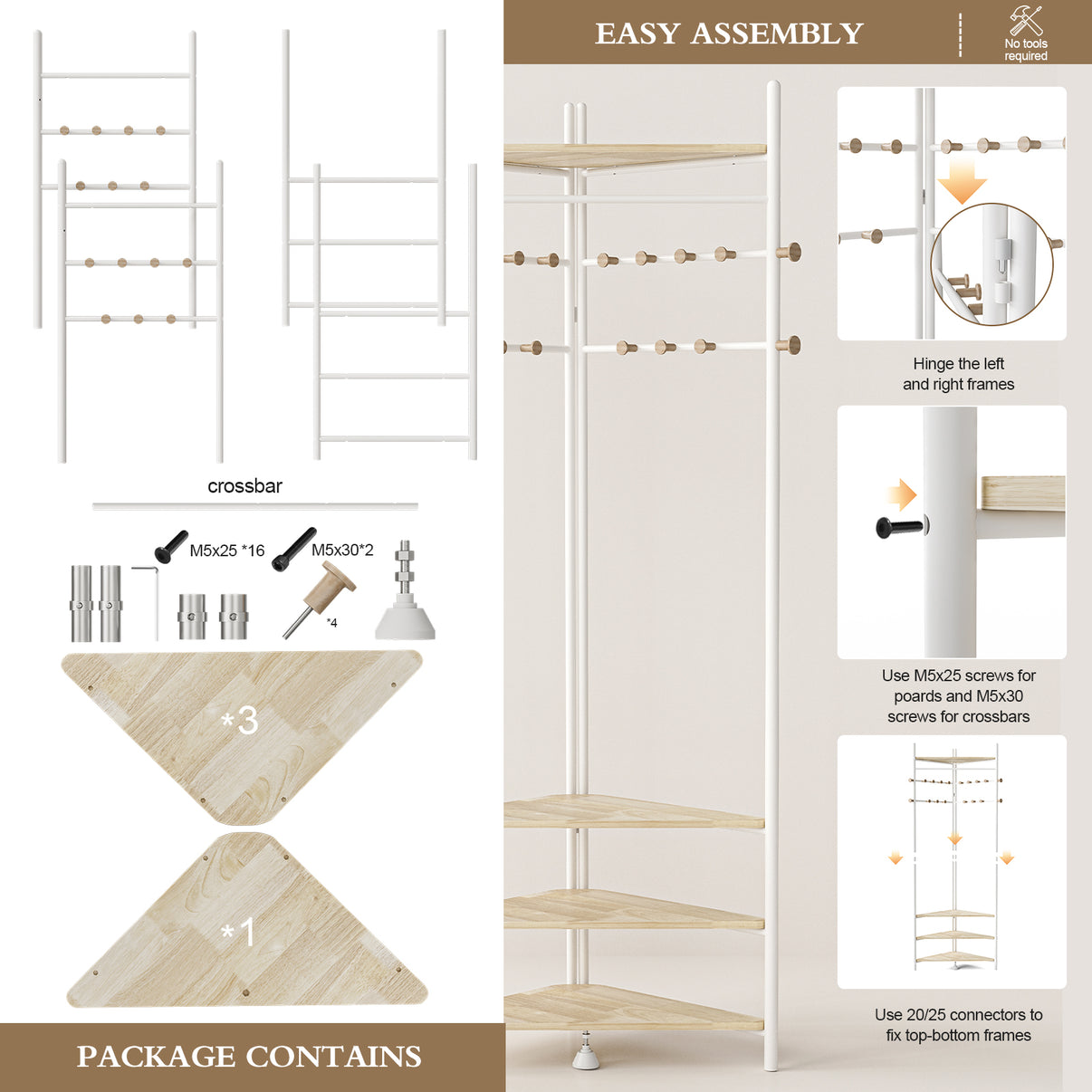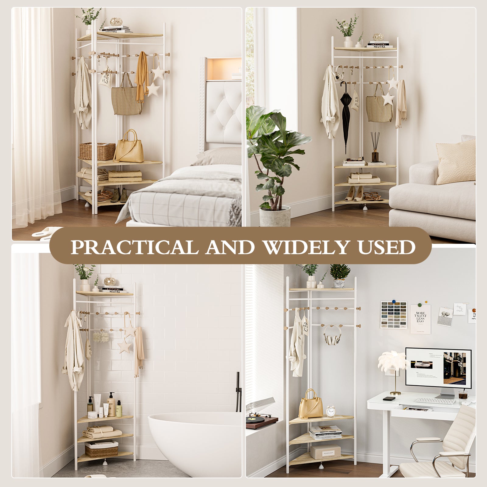 KAPANOU Corner Metal Coat Rack Freestanding Entryway Clothes Hanger with 18 Wooden Hooks and 4 Shelves for Bedroom (White)