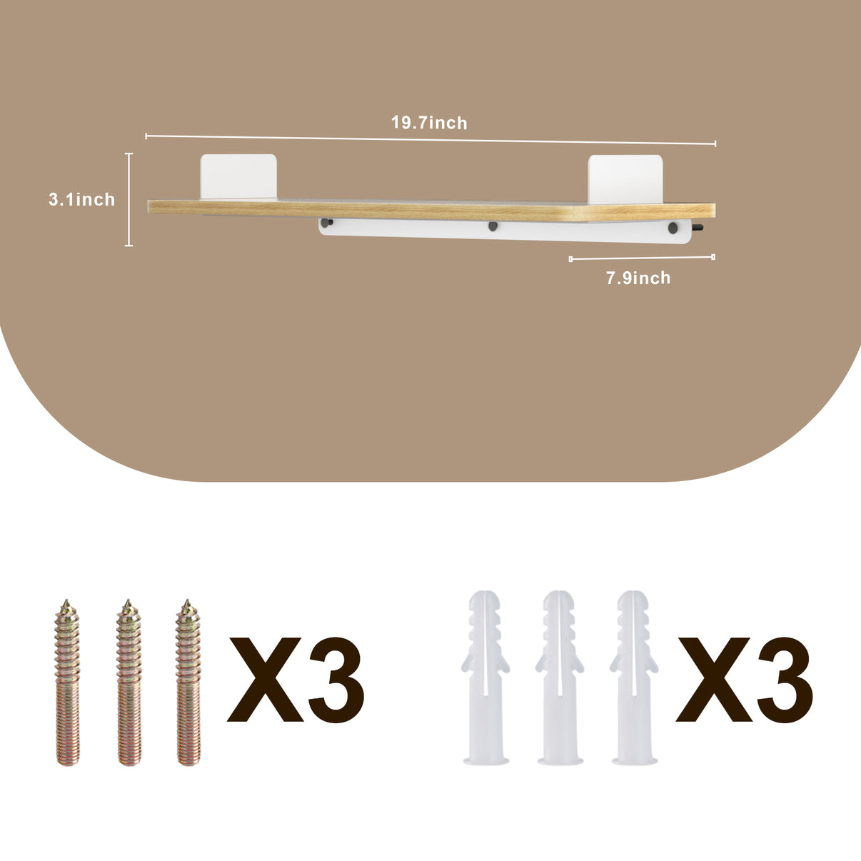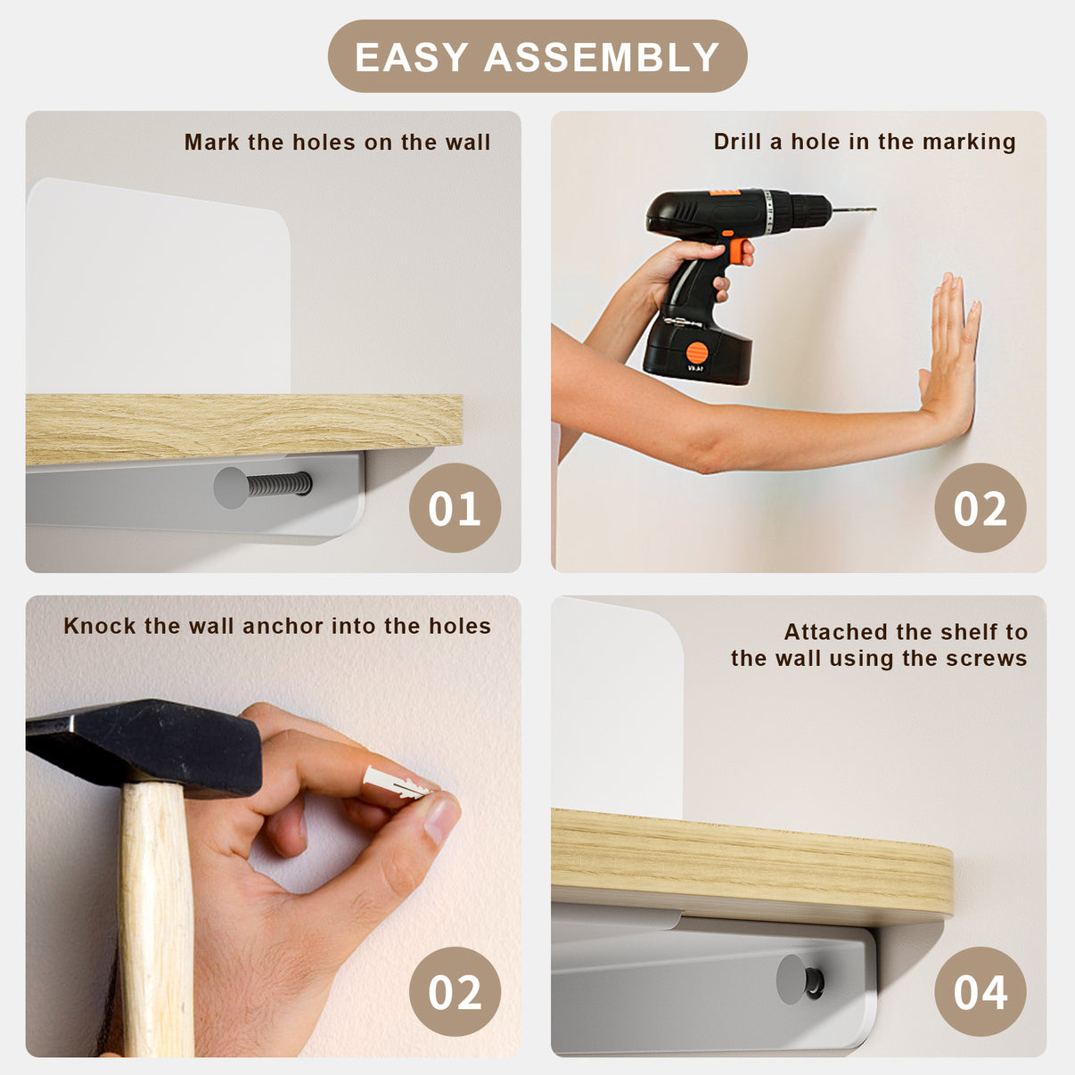 【Easy Assembly】 It’s quite easy to install this wall-mounted floating shelf. Just mark the holes on the wall, drill a hole in the marking then knock the wall anchor into the holes. Last attached the shelves to the wall using the screws provided. Then will be finished.
