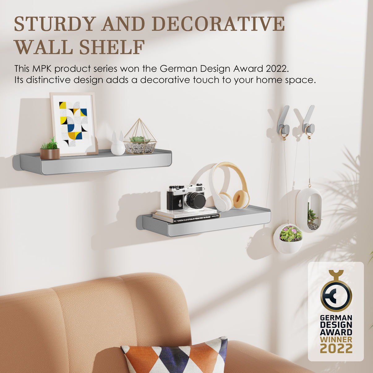 This KAPANOU floating shelf have been awarded the 2022 German Design Award. Constructed from durable and high-quality aluminum metal, they are waterproof, sturdy, and rust-resistant. These minimalist shelves not only add a decorative touch to your home but also offer ample space to display or store a variety of items. Ideal for showcasing books, frames, plants, children's toys, organizing bathroom essentials, or kitchen spices, these shelves help keep your home tidy and organized. Their simple yet modern design allows for a visually pleasing and orderly arrangement of items in your home, creating a sense of relaxation and joy.