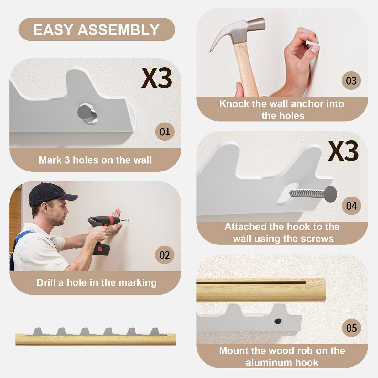 Easy AssemblyIt’s quite easy to install this coat rack on the wall. Just mark the holes on the wall, drill a hole in the marking then knock the wall anchor into the holes. Last attached the hook to the wall using screws and mounted the wood rob on the aluminum hook.